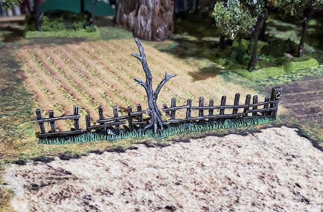 This was followed by Citadel Contrast Colors - Basilicanum Gray for the stones, Wyldwood Brown for the wooden fencing, one of the yellows for the wattle fencing. They could have been finished at that point but there were a fair amount of details to pick out, ubiquitous skulls, iron rings, logs and misc.